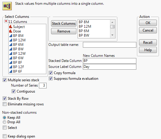 Each BP (blood pressure) column is delineated according to the date and time. The BP 8M column corresponds to readings that were taken at 8am on Monday. The BP 12W column corresponds to readings that were taken on 12pm on Wednesday, and so on. The researcher wants to stack all of the blood pressure columns into three columns that correspond to each day: Monday, Wednesday, and Friday.