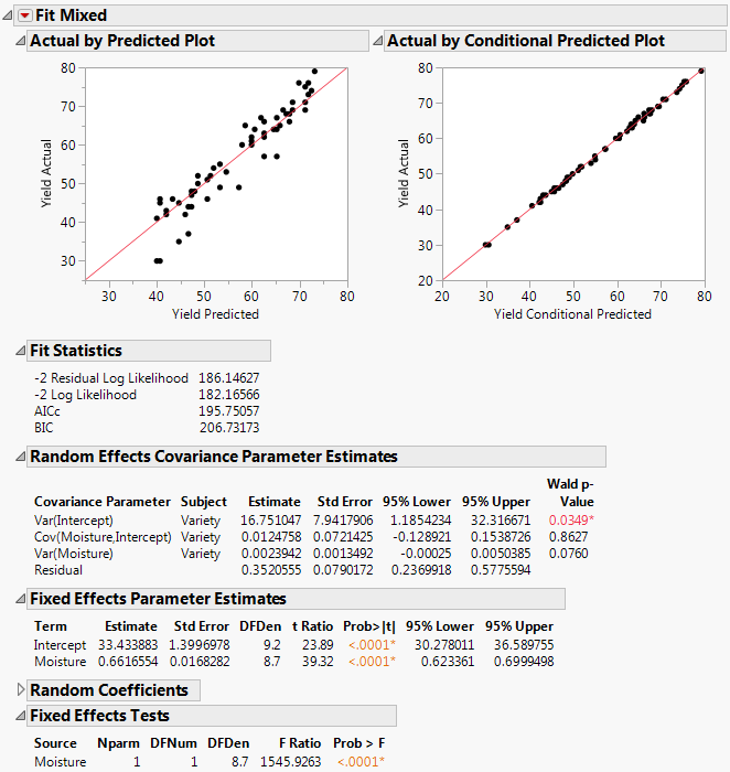 Select Variety from the Select Columns list, select Moisture from the Random Effects tab, and then click Nest Random Coefficients.