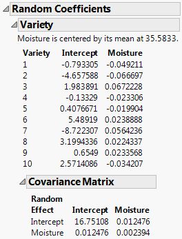 In the Model Specification window, the Center Polynomials option is selected by default. Because of this, the Moisture effect is centered at its mean of 35.583, as stated in the note at the top of the Variety report. From the Fixed Effects Parameter Estimates and Random Coefficients reports, you obtain the following prediction equation for Variety 2: