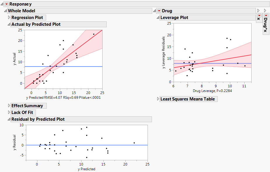 Although the Regression Plot suggests that Drug and the pretreatment measure, x, interact, the Prob > F value in the Effect Tests report does not support that conclusion. The Effect Tests report also shows that x is significant in explaining y, but Drug is not significant. The study does not detect a difference among the three groups. However, you cannot conclude that Drug has no effect. The drugs might have different effects, but the study size was not large enough to detect that difference.