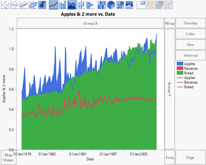 Because banana prices are uniformly smaller than prices for apples and bread, the layer for Bananas is at first entirely hidden behind the other two layers. The apples price is hidden behind the bread price for some months. Use the Line element to see prices for all three clearly.