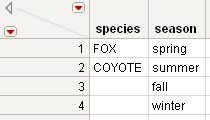 The data in Species1.jmp is crossed with the data in Species2.jmp to produce the joined table, which shows all combinations of the values in each set.