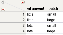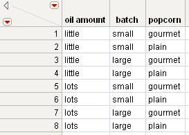 The second join combines the resulting table (Cartesian oil amount + batch) with the Popcorn Type.jmp table and produces a final table with all tables joined.