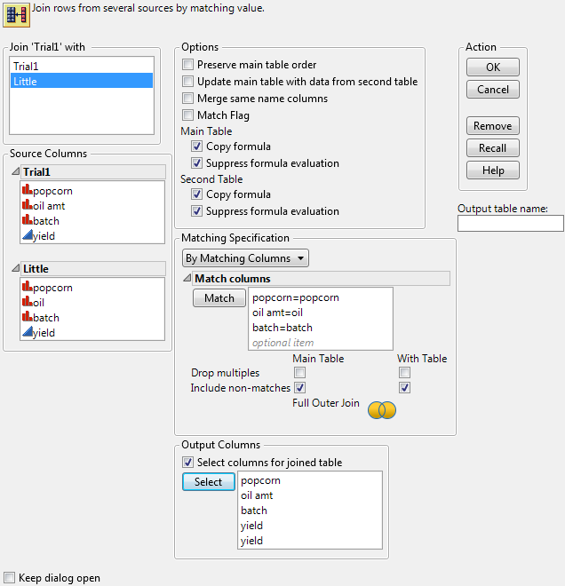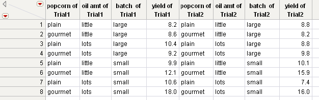 In the joined table, you want only one column for popcorn, one column for oil, and one column for batch. However, you want two columns for yield: one representing the yield from Trial1.jmp, and another representing the yield from Little.jmp.