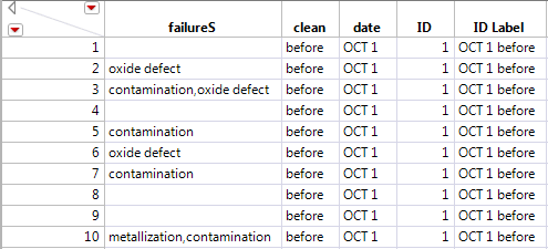 The Failures3Delimited.jmp sample data table has a row for each unit with a single column in which the defects are recorded, delimited by a comma. Note in the partial data table, shown in Figure 3.20, that some units did not have any observed defects, so the failureS column is empty.