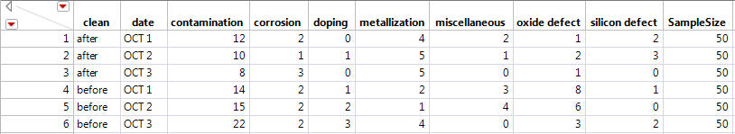 The Failure3Freq.jmp sample data table has a row for each batch, columns for each defect type, and a column for the batch size. The data entries in the defect columns are the frequency of occurrence of the defect in the batch.