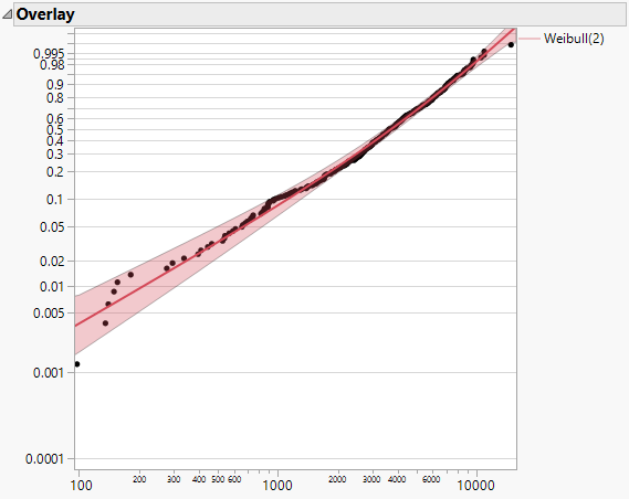 A probability plot for a single Weibull distribution fit appears in Figure 3.23. Note that the fit is not very good in the lower part of the range of Y2.