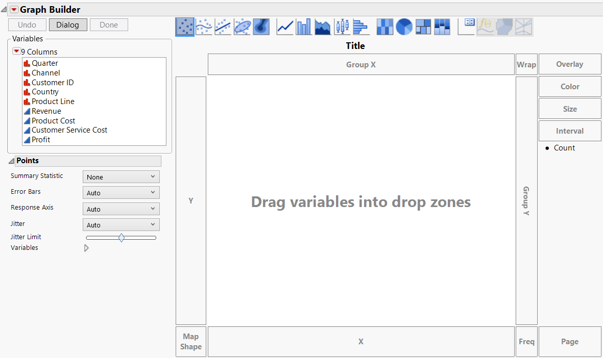 Note: Only some of the Graph Builder features are covered here. For complete details, see Graph Builder in the Essential Graphing book.