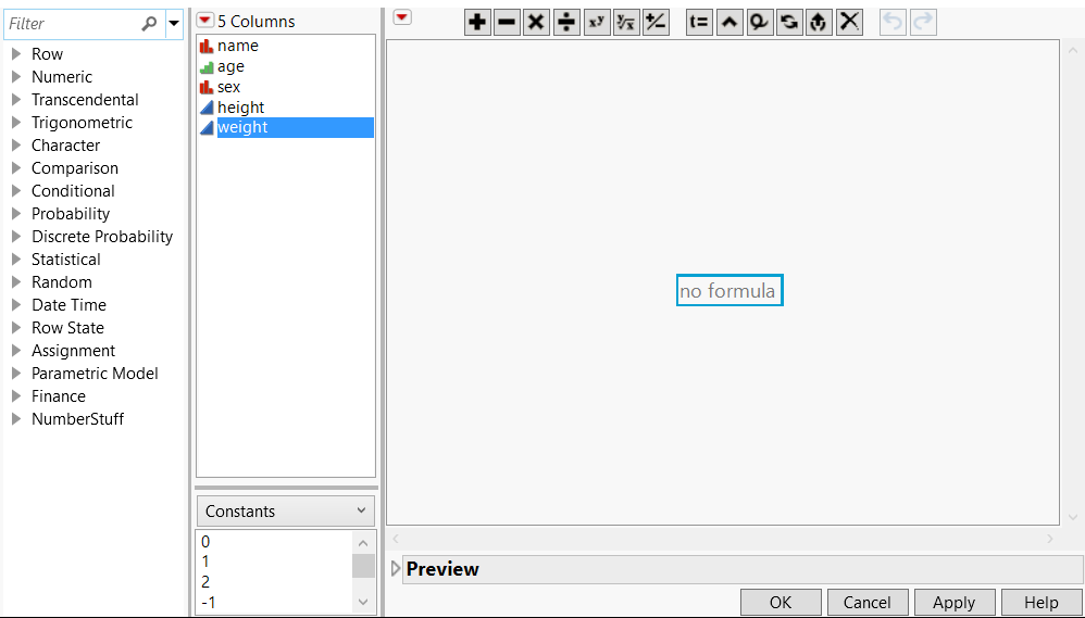 Either type in a number or select Constants in the middle pane, as shown in Figure 7.9. Then click a value in the list that appears: 0, 1, 2, -1, pi, e. The value appears in the outlined box.