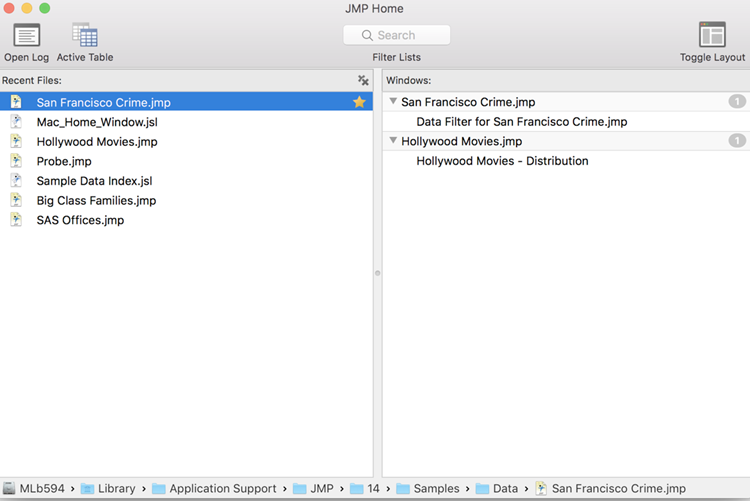 Open the JMP Home window on Macintosh by selecting Window > JMP Home (Figure 2.15). To view the window each time you open JMP, select JMP > Preferences > General > Home Window.
