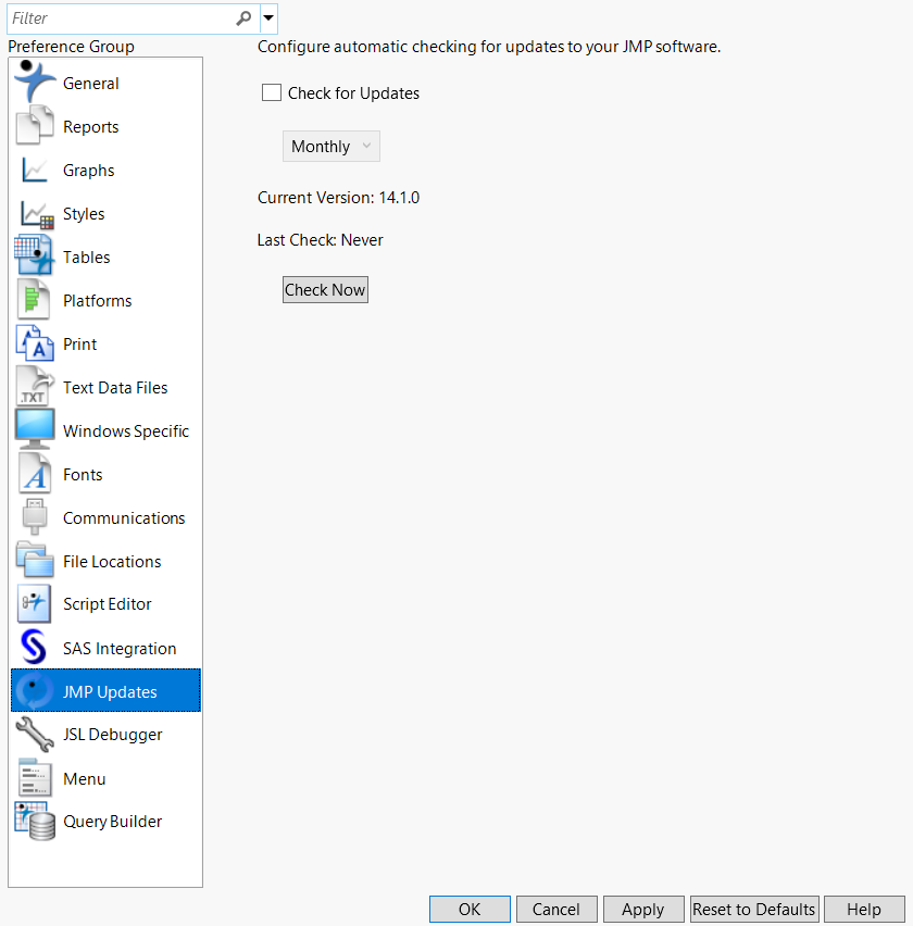 The JMP Update preferences show you what version of JMP you currently have, the last time it was updated, and whether and how often JMP checks automatically for updates.
