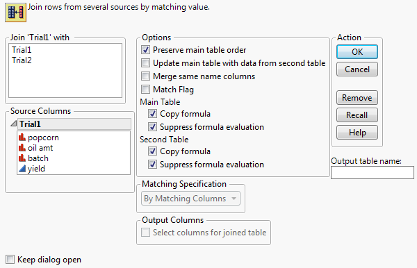 If you are matching by column, Match Flag is selected when you select Merge same name columns. The new joined table contains a nominal column named Match Flag: