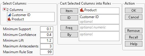 You can specify a Multiple Response modeling type column for the Item role. In this format, the Item role is required, the ID and Freq roles are optional. If an ID role is specified, all rows with the same ID are combined into one transaction. If a Freq role is specified, the frequency applies to the transaction, not the specific items in the transaction.