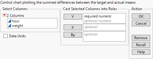 Launch the CUSUM Control Chart platform by selecting Analyze > Quality and Process > CUSUM Control Chart.