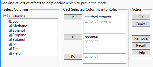 To launch the Fit Definitive Screening platform, select DOE > Definitive Screening > Fit Definitive Screening. The launch window in Figure 8.7 uses Extraction3 Data.jmp.