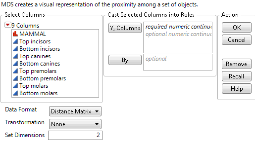 A set of columns that contain measures of a quality or characteristic of an object. The objects are typically named in a column. The object column is not used in the analysis but rather is used as a label for the data points on the MDS plot.
