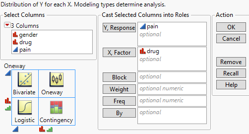 Note: You can also launch a oneway analysis from the JMP Starter window. Select View > JMP Starter > Basic > Oneway.