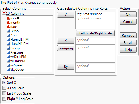 The columns assigned to the Y role have a left- or right-pointing arrow to the left of the column name. This arrow designates on which vertical axis (on the left or right of the plot) the variable appears. Change the designation by highlighting the column in the Y list and clicking the Left Scale/Right Scale button.