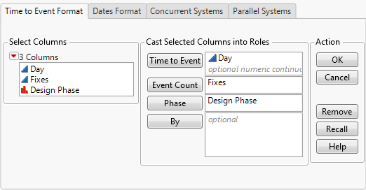 Launch the Reliability Growth platform by selecting Analyze > Reliability and Survival > Reliability Growth. The launch window, using data from TurbineEngineDesign1.jmp, is shown in Figure 10.6.
