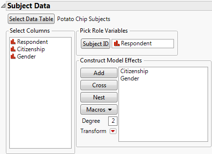 Figure 5.12 shows the Subject Data outline populated using Potato Chip Subjects.jmp.