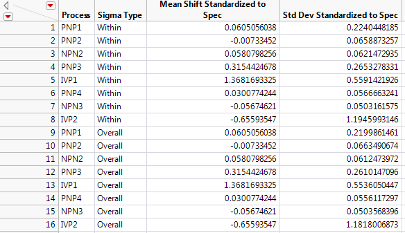 The Make Goal Plot Summary Table option produces a summary data table that includes each variable’s name, its spec-normalized mean shift (Mean Shift Standardized to Spec), and its spec-normalized standard deviation (Std Dev Standardized to Spec). For each variable, there is a row for each of the sigma types.