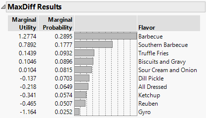 The estimated probability that a subject expresses a preference for the corresponding level of the effect over all other levels. For each effect, the marginal probabilities sum to one.