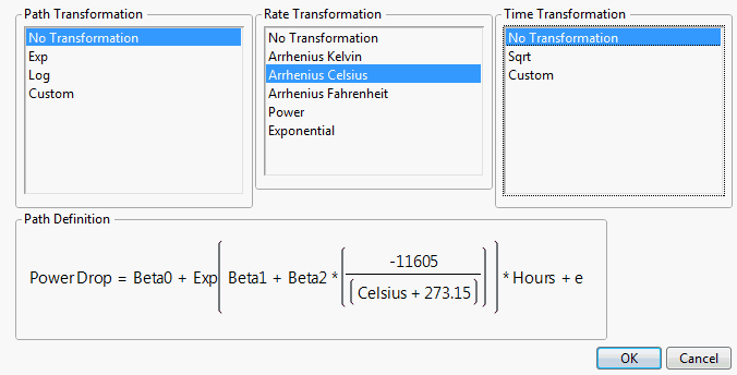 To model nonlinear degradation paths, select Degradation Path Style > Nonlinear Path from the platform red triangle menu. This is useful if a degradation path cannot be linearized using transformations, or if you have a custom nonlinear model that you want to fit to the data.