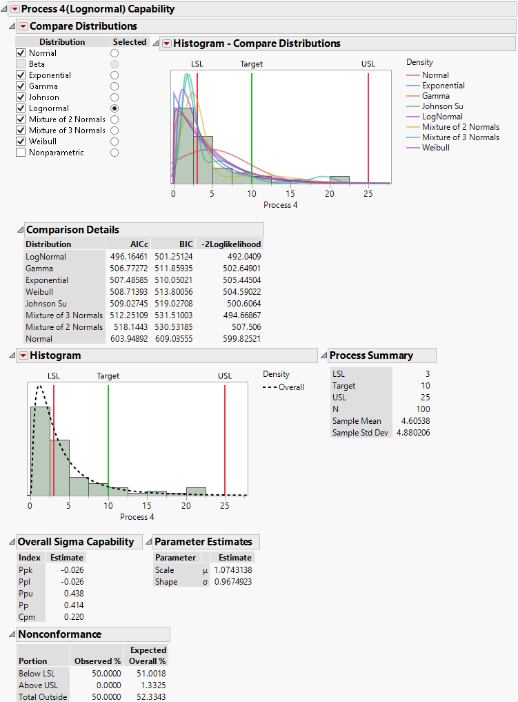 The title of the report for Process 4 indicates that the capability calculations are based on a lognormal fit. All of the check boxes in the Compare Distributions report, except the boxes for Nonparametric and Beta, are checked, indicating that these six distributions are fit. (This is because you requested a Best Fit in the launch window.) The button that is selected in the Selected column indicates that the Lognormal distribution is the distribution that is used in the remainder of the Process 4(Lognormal) Capability report to estimate capability and nonconformance.