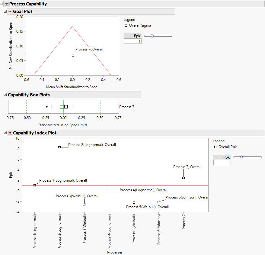 The Capability Index Plot shows Ppk values for all seven processes. Only two processes, Process 2 and Process 7, have capability values that exceed 2. Note that the best fitting nonnormal distributions are shown in parentheses to the right of the variable names in the Capability Index Plot. The best fitting distribution for Process 7 is not shown because it is a normal distribution.