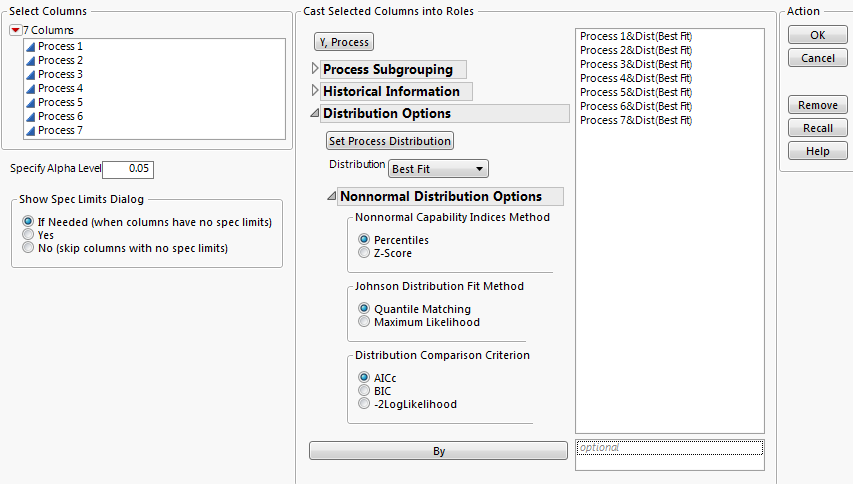 The suffix &Dist(Best Fit) is added to each variable name in the Y, Process list. The Best Fit option specifies that the best-fitting parametric distribution should be fit to each variable. The available parametric distributions are normal, beta, exponential, gamma, Johnson, lognormal, and Weibull. See Figure 11.3.