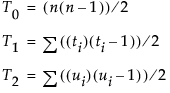The ti (the ui) are the number of tied x (respectively y) values in the ith group of tied x (respectively y) values.