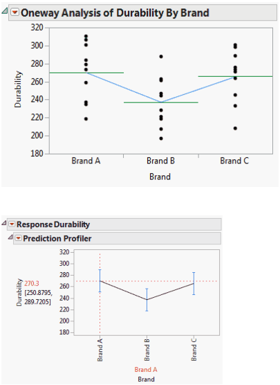 The second plot is a profiler plot obtained using Fit Model. This second plot shows the predicted responses for each brand, connected by line segments. To produce this plot, run the script Fit Model: Durability by Brand in the Golf Balls.jmp sample data table. Drag the vertical dashed red line to the brand of interest. The horizontal dashed red line updates to intersect the vertical axis at the predicted response.