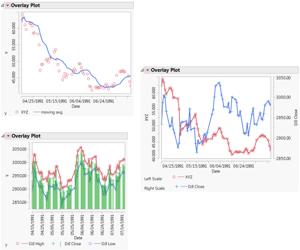 The Overlay Plot option produces plots of a single X column and one or more numeric Ys and does not accept non-numeric values for the y-axis. Curves can also be shown as separate plots for each Y with a common x-axis. Plots can be modified with range and needle options, color, log axes, and grid lines. Curves with two different scales can be overlaid on the same plot with the addition of a right axis.