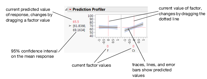 The Prediction Profiler displays profile traces (see Figure 2.2) for each X variable. A profile trace is the predicted response as one variable is changed while the others are held constant at the current values. The Prediction Profiler recomputes the profiles and predicted responses (in real time) as you vary the value of an X variable.