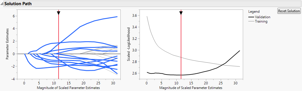 This action highlights that effect’s path in the Solution Path Plot and selects the columns Age and Markers in the data table.