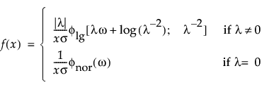 Returns the probability density function (pdf) evaluated at x of a log generalized gamma probability distribution with parameters mu, sigma, and lambda. The pdf is parameterized as follows: