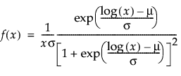 Returns the probability density function (pdf) evaluated at x of a loglogistic distribution with location mu and scale sigma. The pdf is parameterized as follows:
