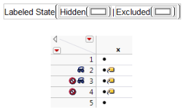 The example in Figure A.22 assigns row state conditions to a row state column. The formula for the row state column (in the column called x) checks to determine whether the active row state is either Hidden or Excluded, and if so, assigns the Labeled row state.