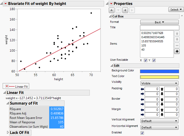 In Figure 11.5, the Summary of Fit statistics were selected below the graph. The Background Color and Text Color were then changed in the Properties. These changes are preserved when you save the report as a script or journal the report.