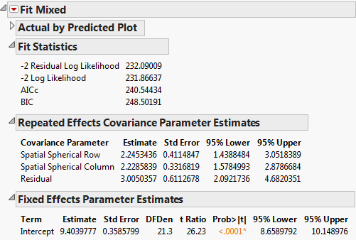 The Fit Mixed report is shown in Figure 8.36. The fit statistics indicate not as good a fit as the isotropic (spatial structure) spherical model (AICc 240.54 compared to 234.08). The Repeated Effects Covariance Parameter Estimates report shows that the estimates for the Row (Spatial Spherical Row) and Column (Spatial Spherical Column) covariances are very close. There is no evidence to suggest that spatial correlations within rows and columns of the grid differ.