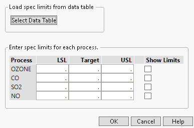 After you click OK on the launch window, the Spec Limits window appears if any of the columns do not contain limits and you did not select No (skip columns with no spec limits) on the launch window. The Spec Limits window also appears if you select Yes on the launch window. Figure 11.7 shows the Spec Limits window for the Cities.jmp sample data table after selecting OZONE, CO, SO2, and NO as process variables in the launch window. Enter the known specification limits and click OK to view the Process Capability report.