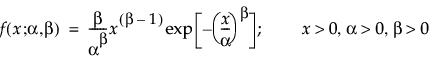 where α is a scale parameter, and β is a shape parameter. The Weibull distribution reduces to an exponential distribution when β = 1.