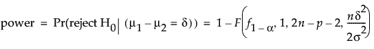F(x, df1, df2, nc) is the cumulative distribution function of the non-central F distribution with degrees of freedom df1 and df2 and non-centrality parameter nc evaluated at x.