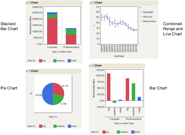 The Chart platform on the Graph menu charts continuous variables versus categorical variables. The continuous variables are summarized for each categorical level. Chart supports several chart types, such as bar charts, pie charts, and line charts. Chart is similar to the Tables > Summary command and is useful for making graphical representations of summary statistics.