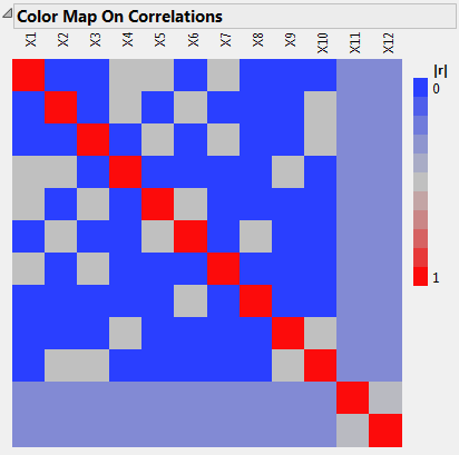 With your cursor, place your mouse pointer over cells to see the absolute correlations. Notice that X1 has correlations as high as 0.5 with other main effects (X4, X5, X7). (Figure 5.19 uses JMP default colors.)
