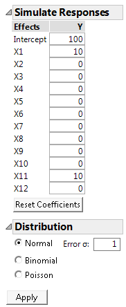 The response columns, Y and Y Simulated, are initiated with the same simulated values. The values are random values from a N(0, s) distribution. where s is the RMSE from the power analysis dialog with a default of 1. The Y Simulated values are updated with randomly generated values using the model defined by the parameter values in the Simulate Responses window. The Y column is intended for your true responses after the experiment has be run.