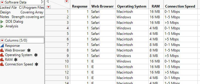 Figure 20.22 Partial View of Covering Array Table for Software Data.jmp Showing Scripts