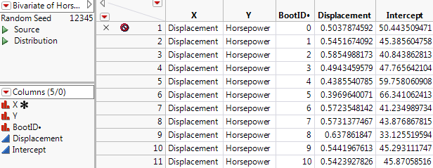 The BootID• column identifies the bootstrap sample. The row where BootID• = 0 corresponds to the original estimates. That row is marked with an X and has the excluded row state. In the unstacked bootstrap table, each row is calculated from a single bootstrap sample.