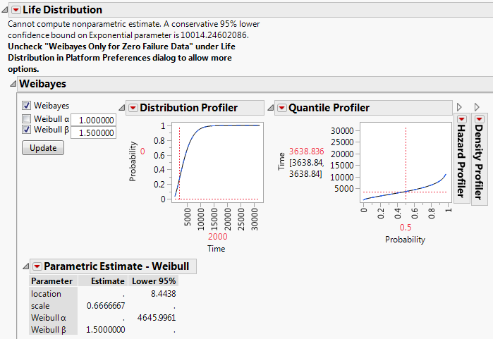 To obtain Weibayes estimates, make sure that Weibayes and Weibull β options are selected. Change the Weibull β value and click Update. The estimates and profilers are updated. The values shown in the profilers use the conservative confidence bound. For an example, see Weibayes Example for Data with No Failures.