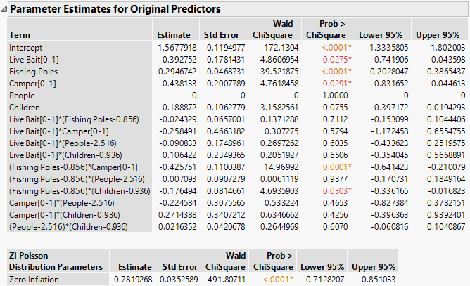The Effect Tests report indicates that five terms are significant at the 0.05 level: Live Bait, Fishing Poles, Camper, Fishing Poles*Camper, and Fishing Poles*Children.